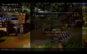 探索パートでは、「フィールドコマンド」を駆使してアイテムをゲットしたり、ストーリーを進めたりすることができます。「フィールドコマンド」には、様々な種類のものがあり、例えばアイテムを手に入れるためのコマンドには、購入する、ねだる、勝ち取るなどがあります。コマンドは必ずしも成功するとは限らず、失敗するとその町の住人との関係が悪化するので注意が必要です。