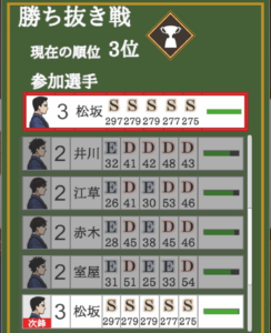それでもこのゲームをぎりぎりゲームたらしめているのは勝ち抜き戦という育成の成果を他人と比べることができる要素であろう。ということでこちらを少しやりこんでみた。というわけで先に結果を張る。